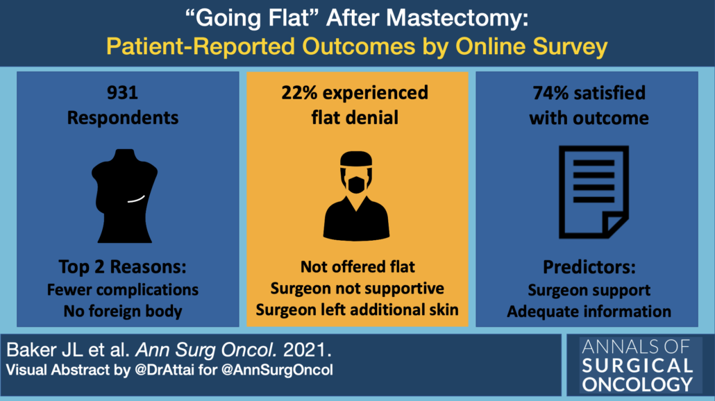 - Strongest predictors of satisfaction were surgeon support of the patient’s decision to go flat and having adequate information about surgical options.