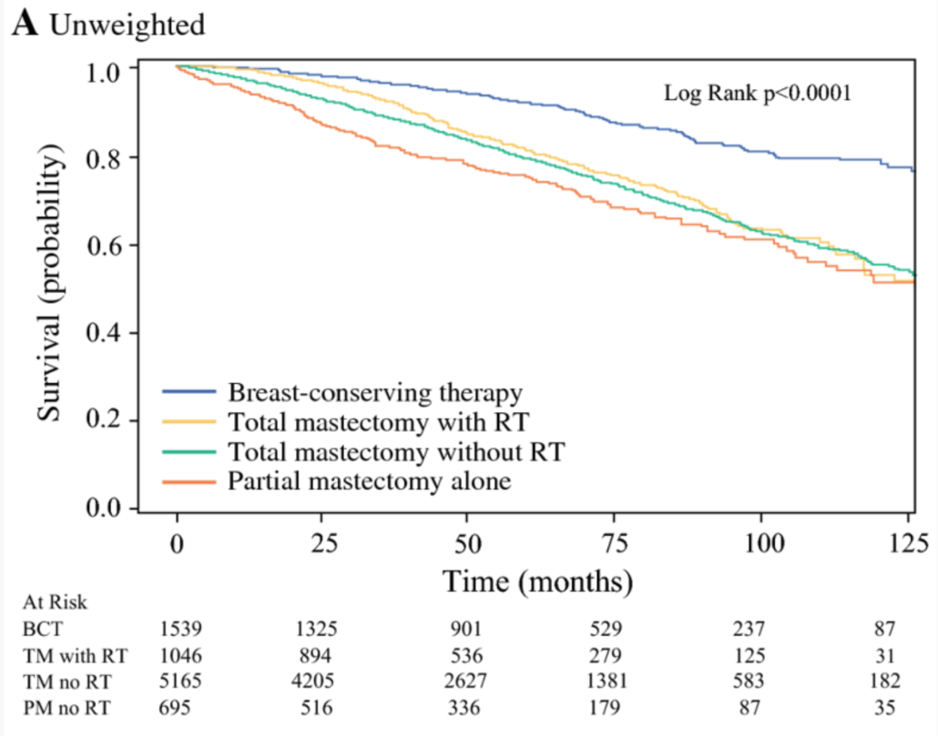 Limitations of the study noted by the authors include the retrospective nature, and the inability to understand some of the factors that influenced the decision for mastectomy versus breast conservation. Her2/neu status was not uniformly reported in the NCDB until 2010, so almost half of the patients in this study did not have this information. They also noted a larger percentage (4.9 vs 1.4%) of patients in the BCT group had triple negative breast cancer, which might explain why more of these patients were also treated with chemotherapy. It is also not clear how much of an influence the use of chemotherapy and endocrine therapy had in terms of the survival rates that were noted.